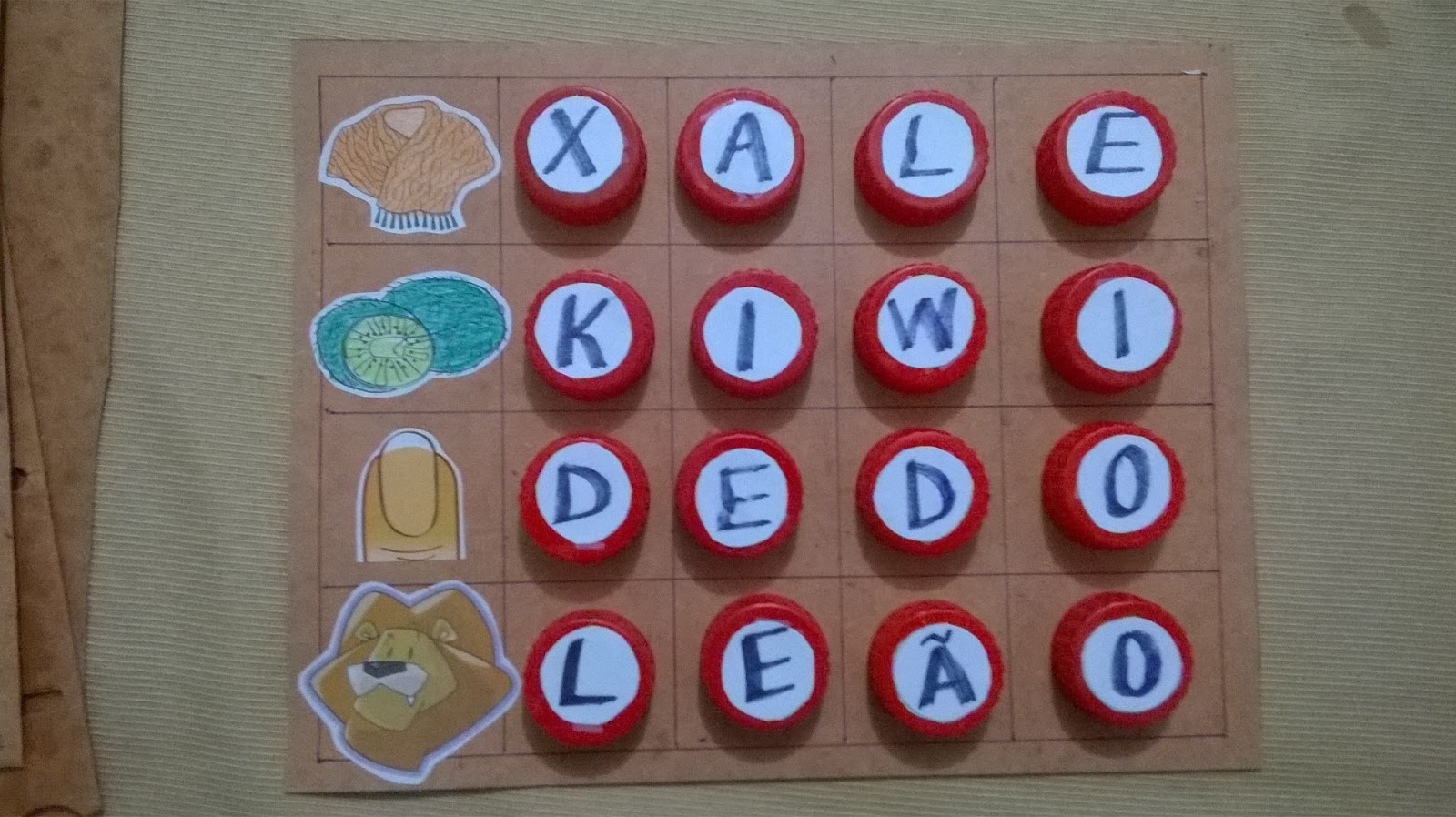 Confeccionei este material utilizando figuras de livros didáticos e tampinhas de refrigerante e suco.