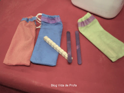 Cada aluno tem seu saquinho de TNT, onde guarda os palitos.